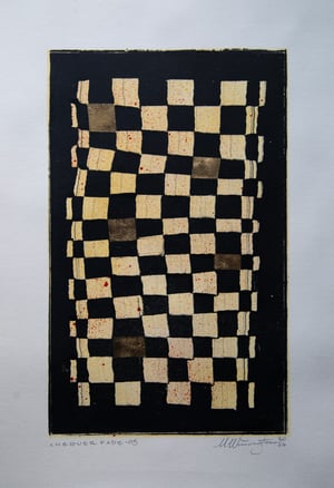 Oil-based Monoprint over spray paint fade with blocks of gold leaf.