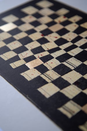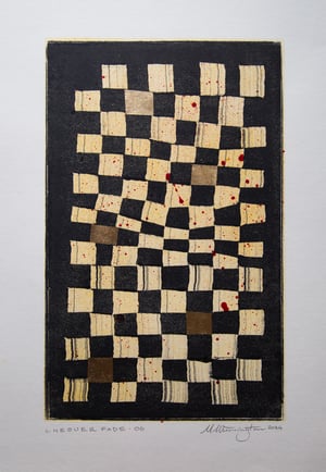 Oil-based Monoprint over spray paint fade with blocks of gold leaf.