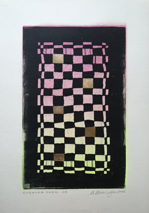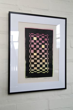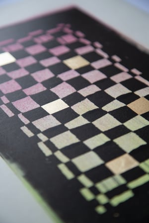 Oil-based Monoprint over spray paint fade with blocks of gold leaf.